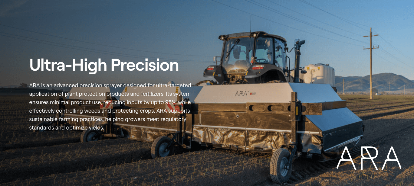 a Swiss-based AI precision agriculture company founded in 2011, specializing in Ultra-High Precision (UHP) spraying technology designed to reduce chemical usage by up to 95%. Their flagship product, the ARA sprayer, uses camera-based AI to identify and treat weeds or plants individually with high accuracy.